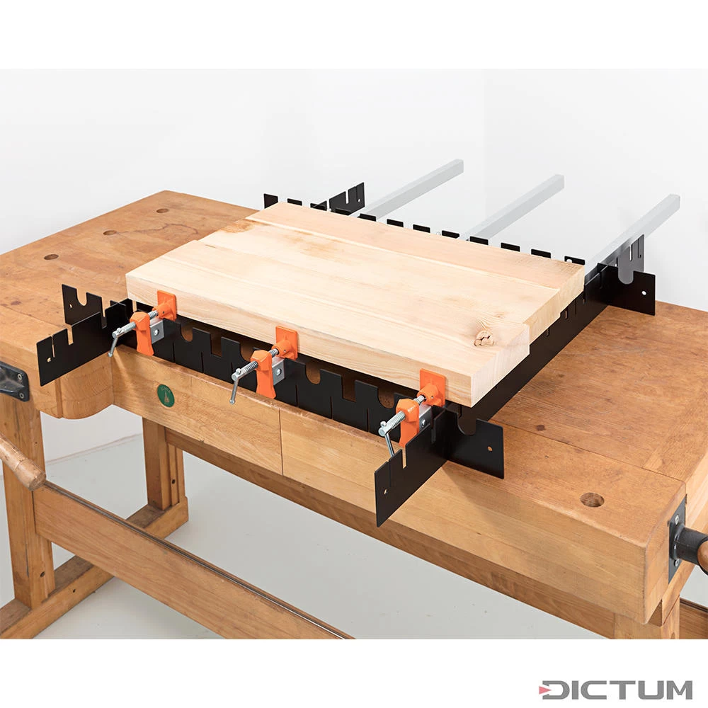 Cette aide à l’encollage en métal facilite et accélère, par exemple, le collage de plaques ou de marches d’escaliers. Grâce aux différents évidements, les serre-joints (par ex. N° 720421), les serre-joints à barre (par ex. N° 708926), les serre-joints en aluminium (par ex. N° 708907) ainsi que les jeux d’éléments de serrage pour tuyaux d’eau,(par ex. N° 708391) à diamètre extérieur ¾ pouces (27 mm) peuvent être utilisés pour coller sans que les serre-joints tombent.