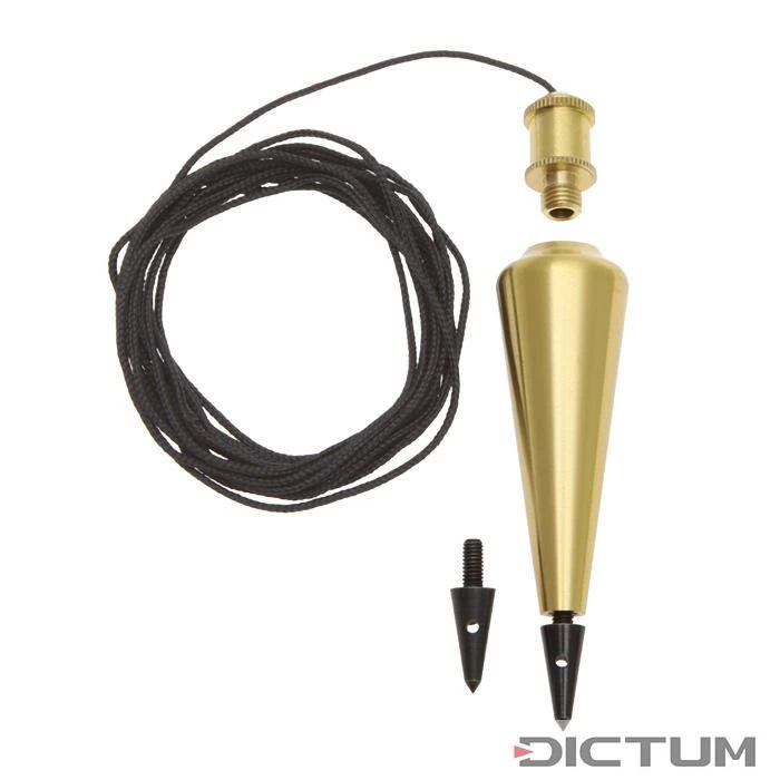 Fil à plomb en laiton laqué avec écrou de cordon et pointe échangeable en acier durci. Le fil tressé de polyamide est résistant à la rupture et aux conditions climatiques, se coupe à chaud pour éviter les franges. Pointe de rechange fournie. Longueur totale 120 mm, longueur du fil 3 m.