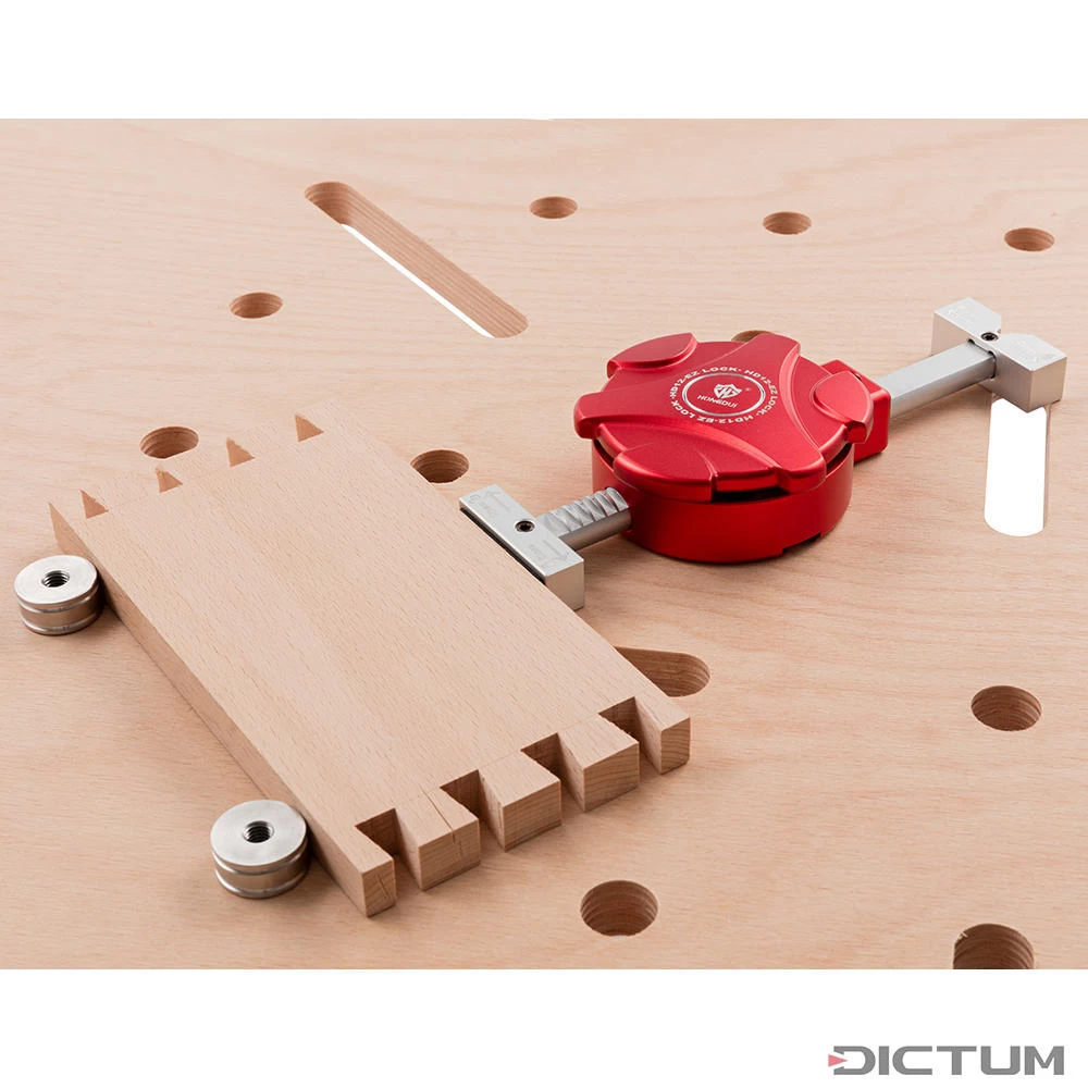 Système de serrage pour établi entièrement fabriqué en aluminium anodisé avec avance par crémaillère. Le disque d’ajustage de grande taille permet un réglage précis et progressif de la pression. Équipé d’un tenon interchangeable sur sa face inférieure, il se fixe dans les trous des établis ou des tables multifonctions. En tournant le couvercle supérieur, la crémaillère se déplace vers l’avant ou vers l’arrière. La faible hauteur des mâchoires (18 mm) est idéale pour le serrage de pièces plates. Les deux plaques de pression sont remplaçables. La découpe en V sur une plaque de pression facilite le serrage de pièces de forme ronde ou la mise en place en diagonale. Livré avec tenons de Ø 19 mm et Ø 20 mm.